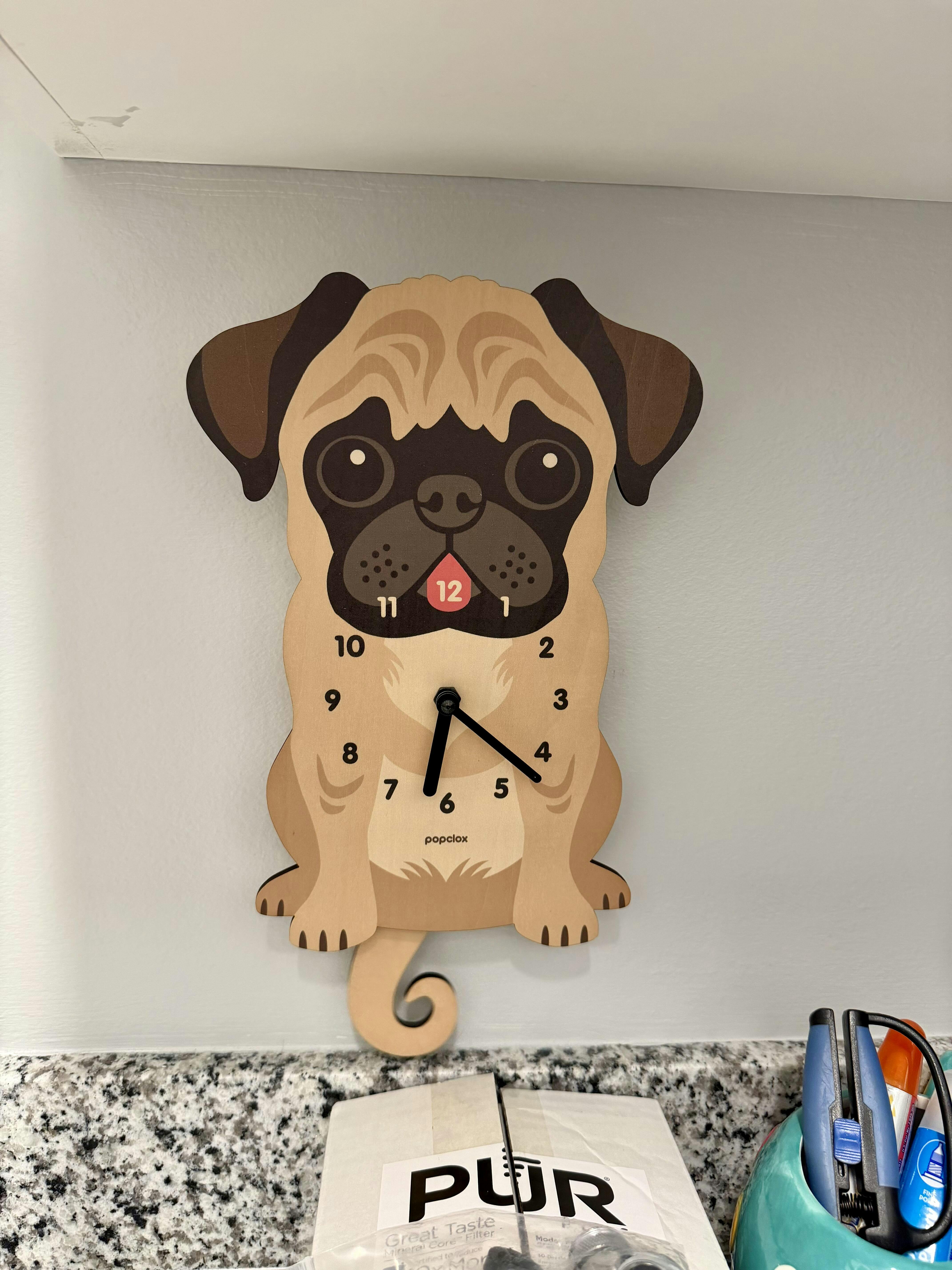 Spruce up your space with our playful pug pendulum clock. Made from wood, this clock features a wagging tail that pug lovers will adore. It’s a joyful way to keep time and add a touch of whimsy to any room. Live the pug life!